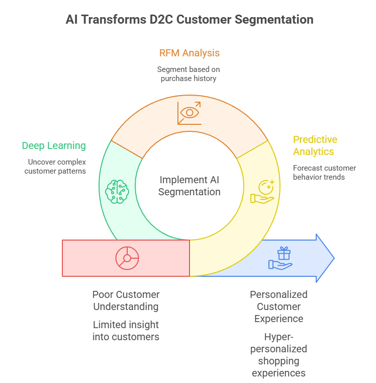 AI customer segmentation uses smart technology to understand your customers better. It breaks down your large customer base into smaller groups based on their behavior, preferences, and needs. This helps D2C (Direct-to-Consumer) brands create highly personal shopping experiences through personalized marketing.