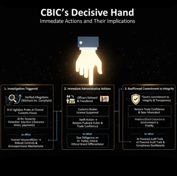 The probe has led to immediate transfers of implicated officers and suspension of a customs broker’s license, affirming CBIC’s commitment to transparent administration and trade integrity.